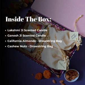 Experience festive joy with our Diwali gift hamper featuring two scented candles in Lakshmi and Ganesha designs. These are paired with beige drawstring bags of cashews and almonds. It is a perfect Diwali gift hamper for family and friends, combining fragrant candles with healthy dry fruits for a memorable festive surprise.