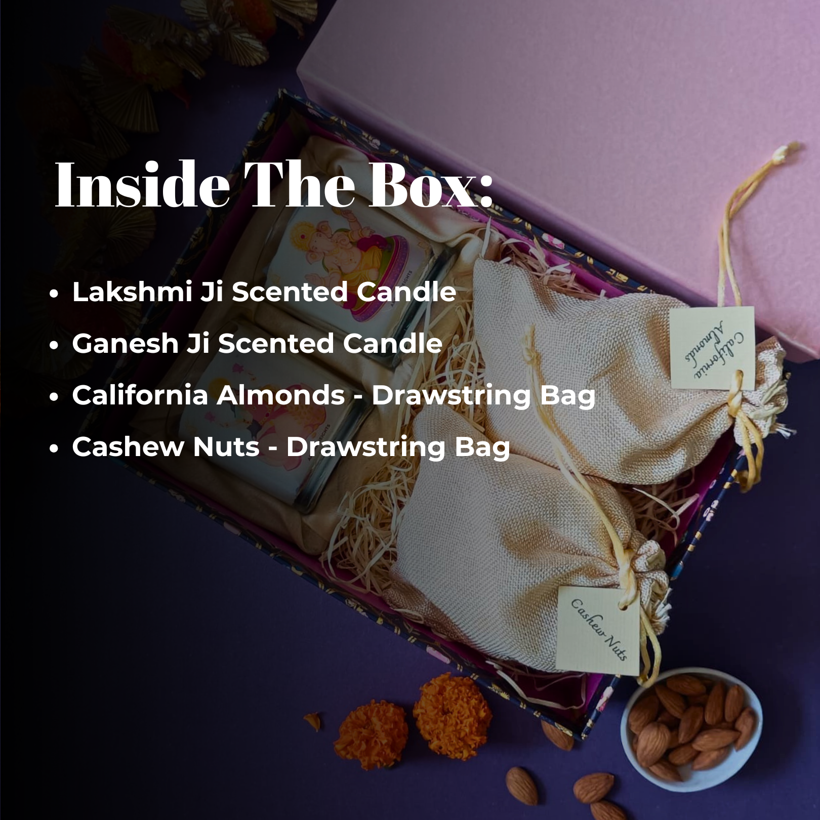 Shubh Deepawali Gift Hamper- Dry Fruits & Lakshmi Ganesh Scented Candle (Rose Bloom)