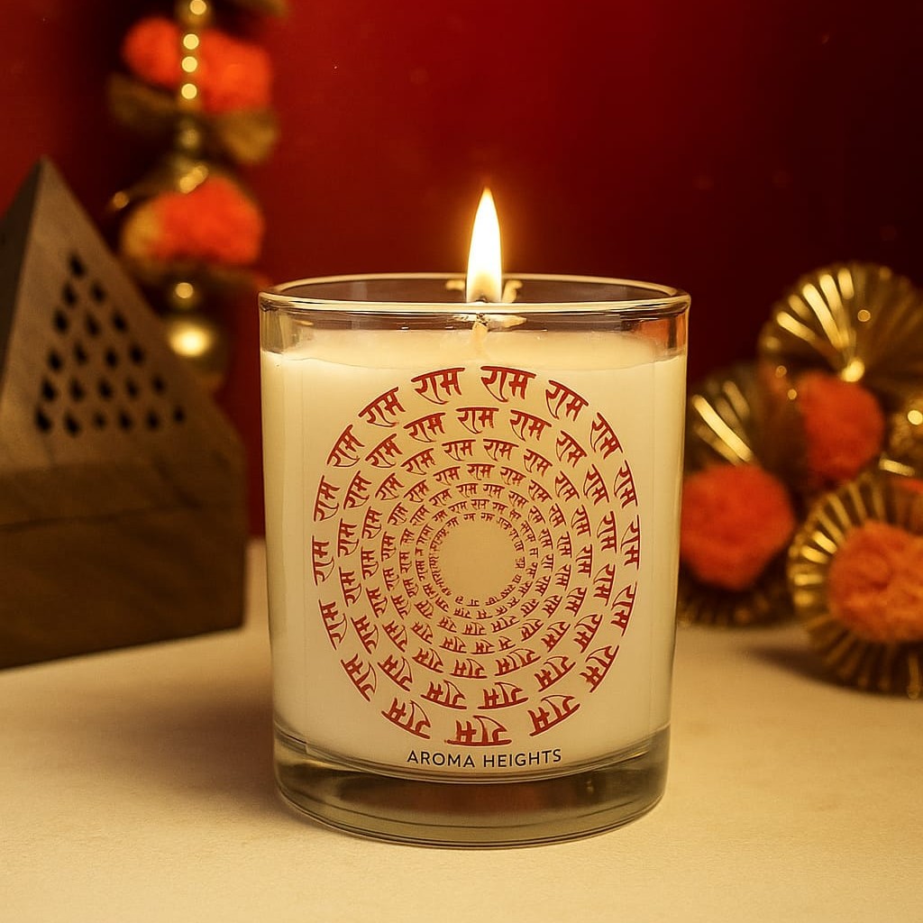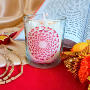 Illuminate your space with this Prabhu Ram scented candle, designed to bring peace, positivity, and divine energy to your home. Featuring a beautiful design on a glass jar, this candle is perfect for prayers, meditation, and festive décor. The soothing fragrance of Loban creates a calming atmosphere.